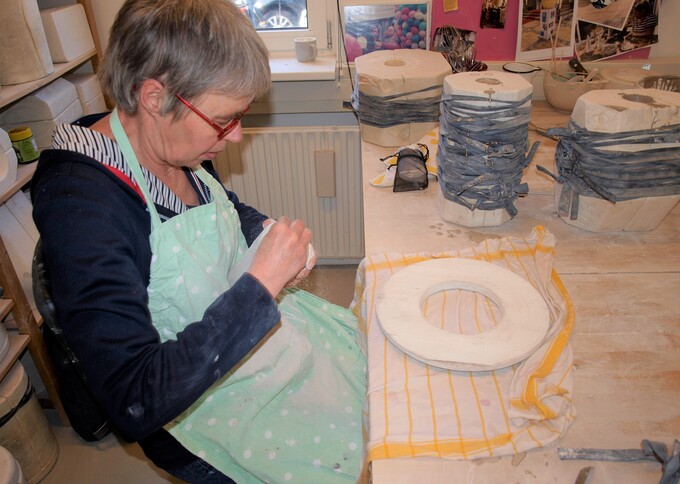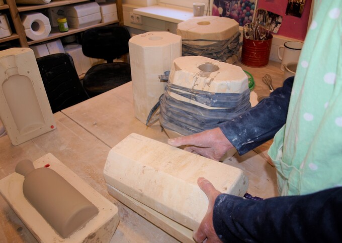 Er komt geen draaischijf aan te pas, bij dat werken met gietklei. ‘Wij werken met mallen’, vertelt Marieke. ‘In deze vormen gieten we klei. Voordat je gaat gieten moet je voorzichtig roeren.’ Dit betekent dus echt rustig aan. Je moet het niet kloppen zoals pannenkoekbeslag want dan ontstaan er luchtbellen. ‘Dat willen we natuurlijk niet’, zegt Marieke. 'We willen mooie dingen maken. Geen misbaksels met bobbels en gaten.’