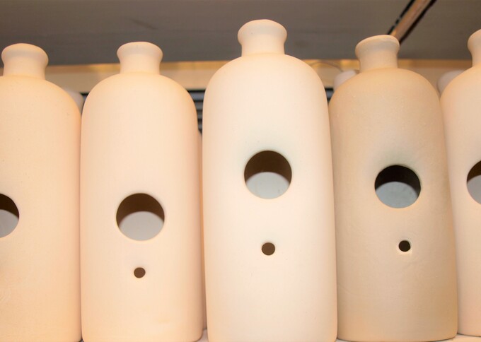 Zijn we nu klaar? ‘Nee, natuurlijk niet’, zegt Marieke. ‘We moeten nog bakken. We zijn in een pottenbakkerij!’ Ruim twee en een halve dag moet het vogelhuisje in de oven. Tijdens dit proces wordt de oven flink opgestookt en bereikt maar liefst 1200 graden °C. En dan magic happens: de klei is veranderd in keramiek! Voorzichtig bevestigt Marieke een touwtje aan het huisje, het zitstokje wordt er met een hamertje ingetikt. Hopla: klaar voor de verkoop! Of er wel eens iets kapot valt? ‘Natuurlijk. Dat hoort erbij. En scherven brengen geluk!’