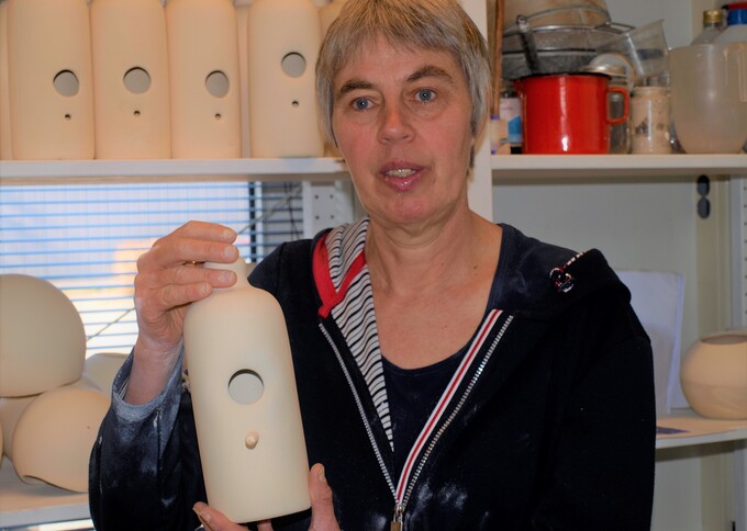 Marieke geeft ons een demonstratie van het maken van een vogelhuisje. Het mat witte huisje in de vorm van een fles is gewild. Het team van De Kei heeft een mooie opdracht binnen om een groot aantal te maken. Dit doen ze onder andere voor het label Eigenmakke van Alliade. Na het volgieten van de mallen, krijgen deze een poosje rust zodat de inhoud kan drogen. Hierna wordt het overige kleimengsel uitgegoten in een ‘restemmertje’. De inhoud van dit emmertje wordt later hergebruikt, vrijwel niets wordt weggegooid. Wanneer de klei voldoende tijd heeft gehad om te drogen, worden de oude fietsbanden waarmee de mallen zijn dichtgesnoerd verwijderd. Marieke: ‘Dat is best spannend. Je kunt dan direct zien of bijvoorbeeld de beker, vaas of in dit geval het vogelhuisje is gelukt.’ De eerste indruk die we krijgen van het demoproduct is positief. Dit wordt gegarandeerd een prachtexemplaar! Marieke vindt haar werk erg leuk, vertelt ze.